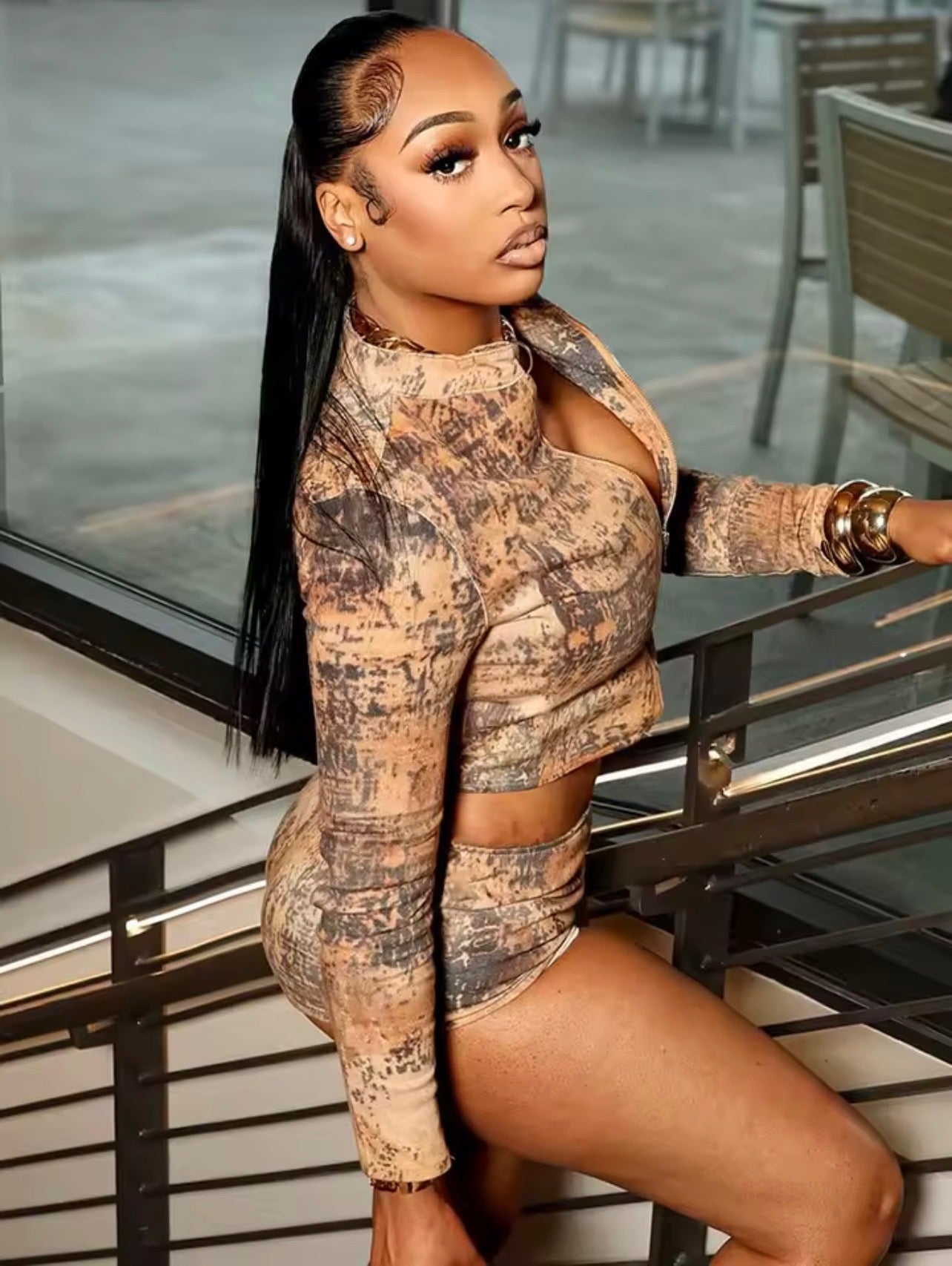 The Luxe Two-Piece Set features a relaxed-fit zip-up cropped jacket (no hoodie) and matching shorts in a soft tan base with bold black graphic spots throughout. Whether you rock it zipped up or layered over a crop, this set is made for effortless off-duty slays.