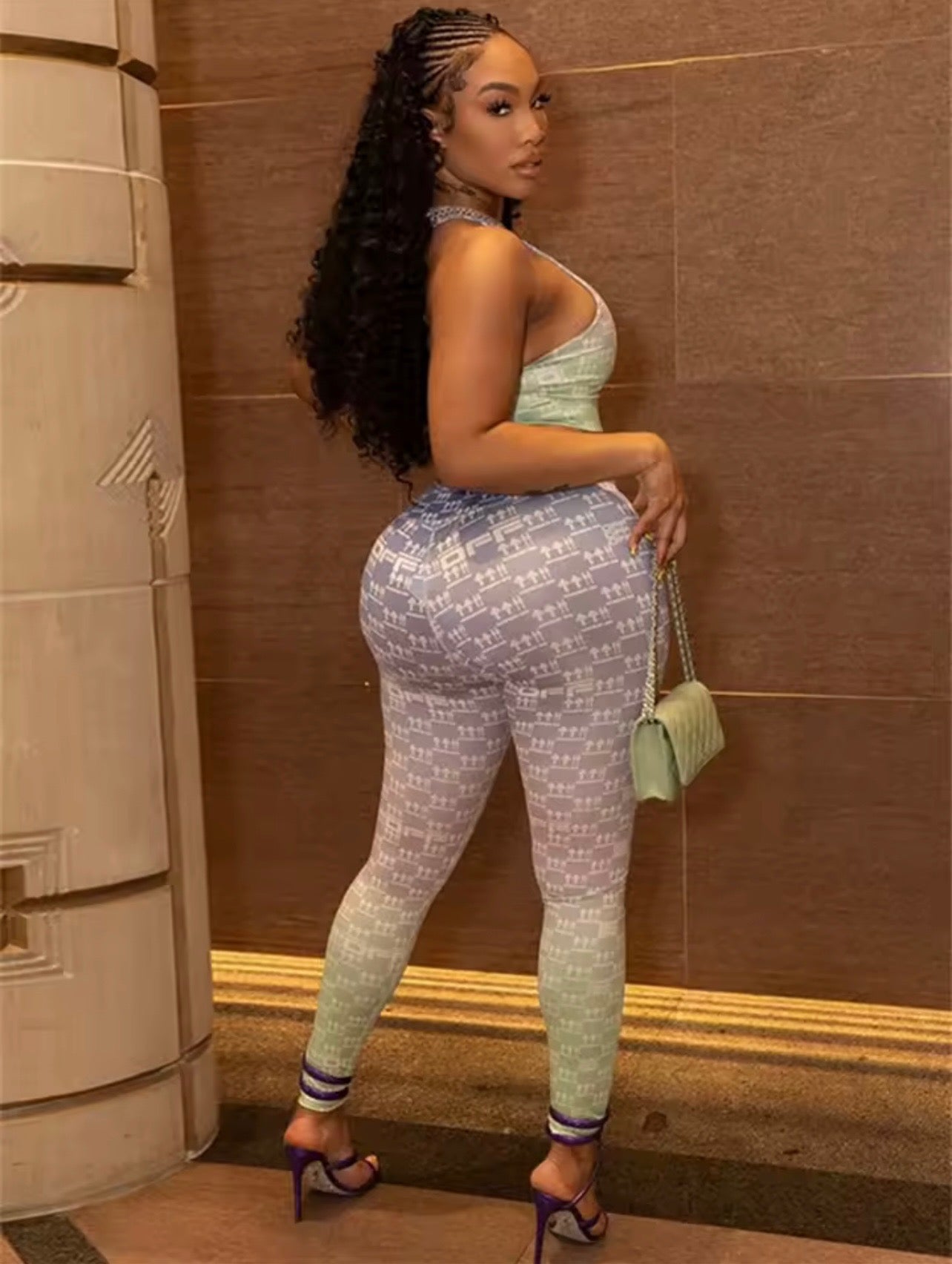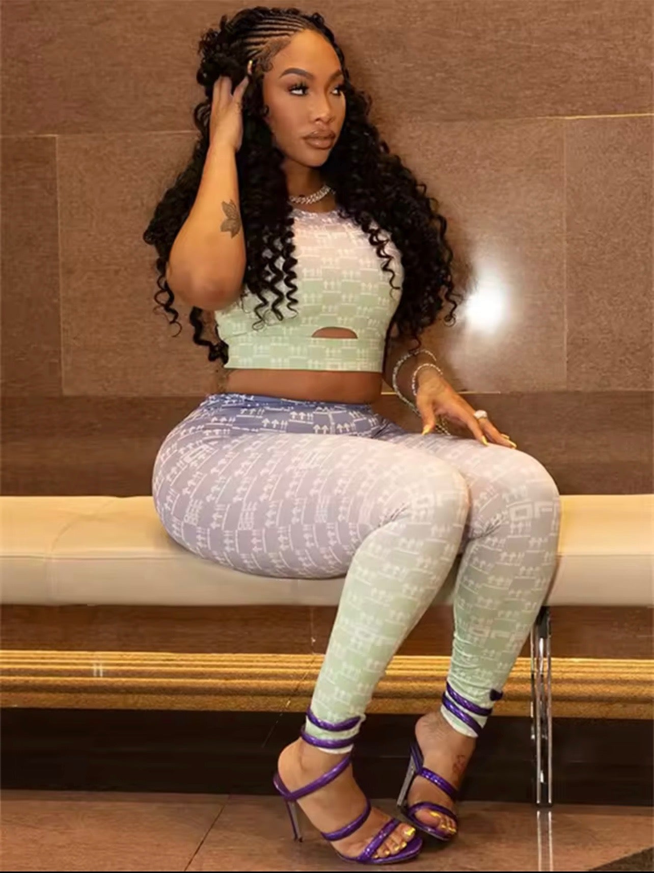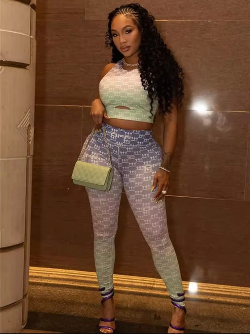 The Mint 2 Be Gradient Set blends pastel ombré tones with a luxe logo-inspired print that feels both playful and polished. Featuring a sleeveless crop top with subtle cutout detail and matching high-rise leggings, this set moves with you while serving looks from every angle.