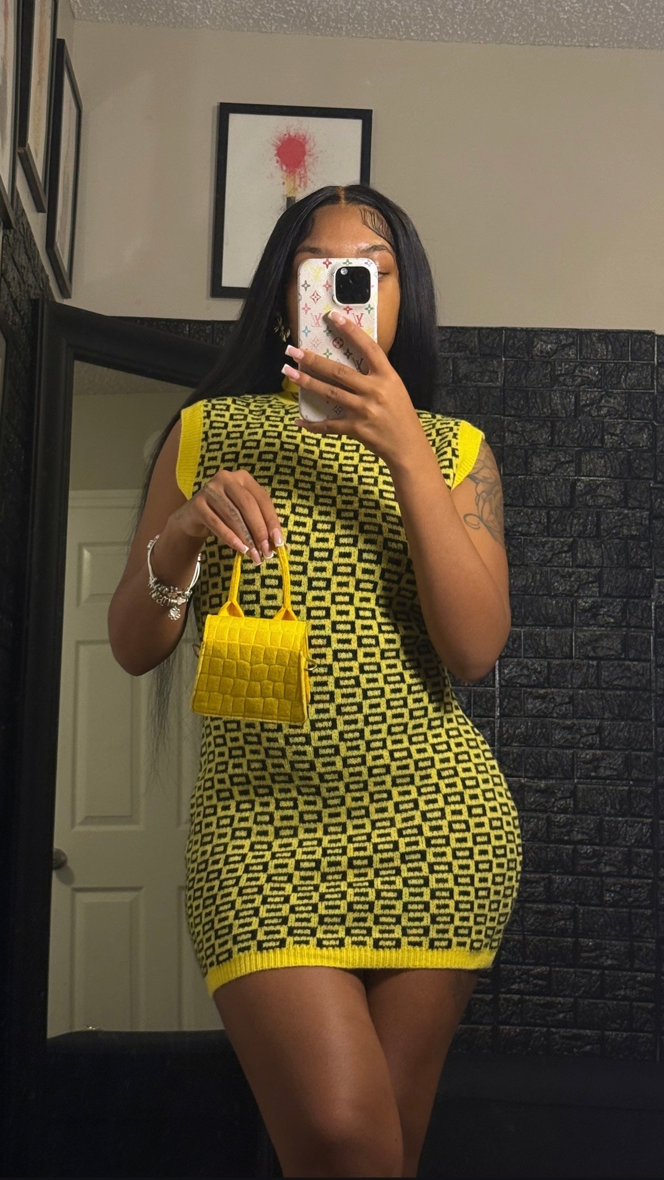 Checkmate, babe — this one’s a power move. The Queen’s Gambit Dress is a sleeveless plaid contrast turtleneck knit mini that blends brains, beauty, and boldness. With its yellow-and-black jacquard pattern and curve-contouring fit, this piece screams chic dominance.